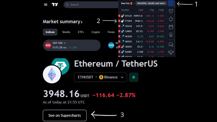 4- Access the Superchart: To access the Supercharts, select the cryptocurrency/market you want to analyze in the top-right corner using the three lines symbol. After making your selection, a page with the chosen cryptocurrency/market will appear. Click on “Supercharts” to proceed.