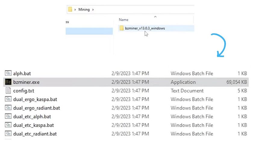 In the folder, you will find two crucial files: “bzminer.exe,” which is your mining program, and “config.txt,” where you can configure your node address for solo mining or your wallet and pool address for pool mining. Once you have set up the “config.txt,” you can open the “bzminer.exe” file to initiate the mining process. This executable file is responsible for running the mining program according to the configurations you have specified, whether it be solo mining to your node or contributing to a mining pool.