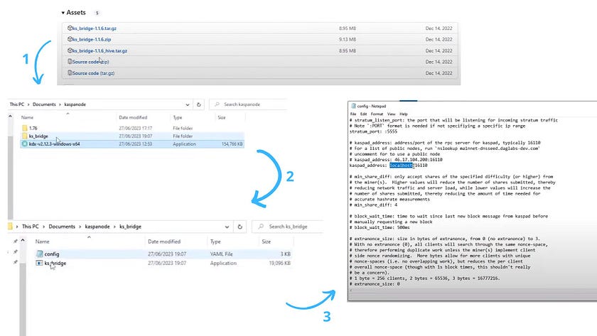 Now that your node is set up, the next step is to connect your node to your CPU. This can be achieved by creating a Stratum, and one effective method is through a stratum-bridge. Download the “ks_bridge” files from GitHub. Open the “config” file using Notepad and replace “localhost” with your IPV4 address (it will look something like this: 174.449.2.234:16127).