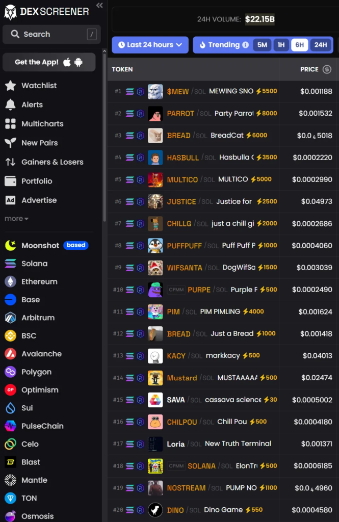 - DEX Screener, which specializes in monitoring decentralized exchange (DEX) activity across various blockchains. It provides real-time data on trades, volume, and price trends, helping users pinpoint active wallets making strategic moves.