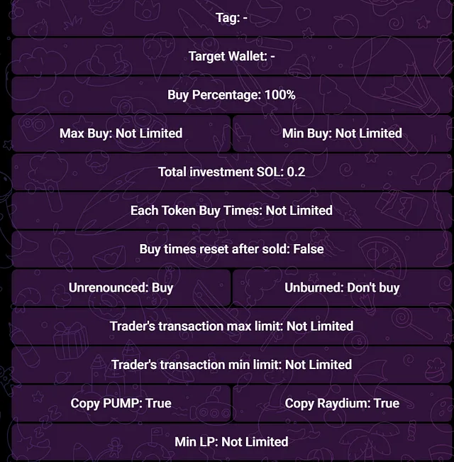 Once you’ve identified the wallet you want to copy, navigate to the “Copy Trade” button within the bot’s menu. Press “Add+”, and a new message will appear, allowing you to configure the settings for your trades. These settings include crucial parameters such as target wallet, trade size, slippage... Each setting plays a vital role in determining how the bot executes trades, so it’s essential to review them carefully.